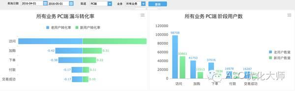如上图所示,点击相应阶段,联动出下面各渠道与各业务的转化率明细,可以看出,各渠道的转化率差别较大,其中pc端转化率明显偏低,而各业务之间的转化率差别不大,基本可以确定,是pc端存在问题,导致转化率偏低。